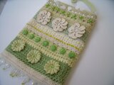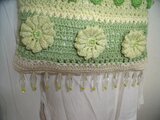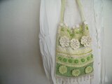かぎ針編みのバッグにビーズ、リボン、花のモチーフで装飾しました。