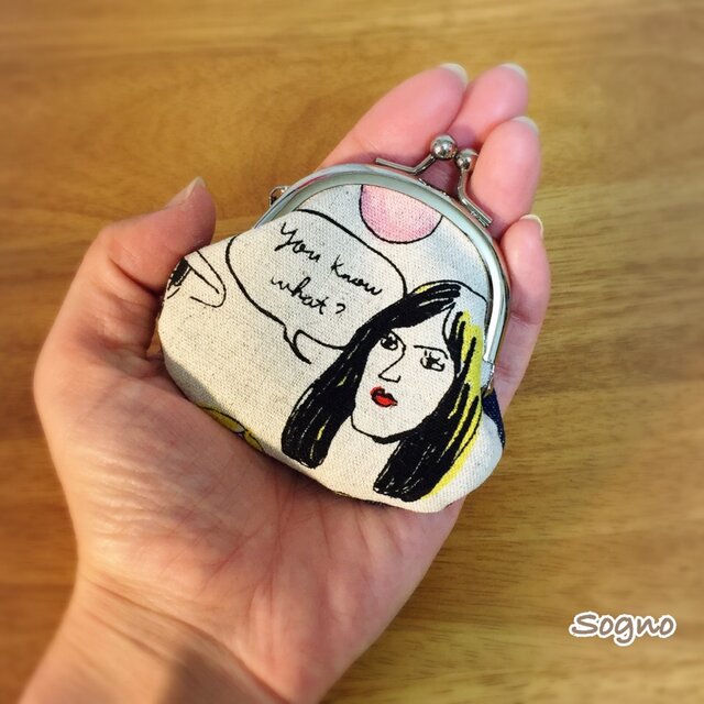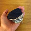 POPな人の顔の孫がま口です。裏面にデニム生地を使い、スマートな仕上がりにしました。内布に甘くならないヒッコリー生地を使うことで、男の人も女の人も持ってもらえるお財布になりました。手の平サイズですので、アクセサリー入れにもちょうどいい大きさです。