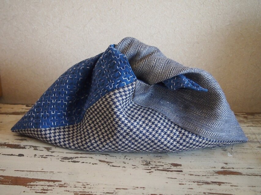すみれ色の千鳥柄とヘリンボーンのポーランドリネンと合わせています。