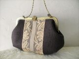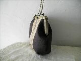 ダークブラウンに近いシックなパープルリネンにアンティークレースをのせたがま口バッグ