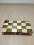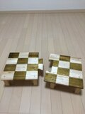パイン材で製作したローテーブルに、格子柄の模様をつけてその上からクリアのトップコートを何層にも塗り重ねて、透き通るような深い艶を出しました。