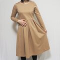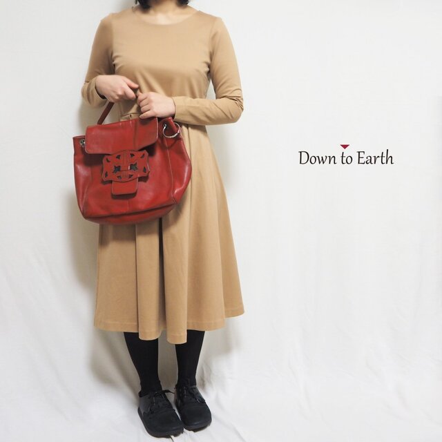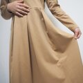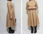 ・少しかためでハリのある生地を使い、フォーマルな印象のワンピースができました。ベージュに黄色味を加えたようなキャメル色で上品さが際立ちます。日常着としてはもちろん、お仕事やちょっとしたパーティーなど、よりかっちりと着たいときにもオススメです。