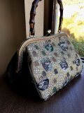 オリーブ色の地に唐草、茶入柄(濃茶器)などが繊細に織り込まれた時代帯の竹の手がま口手提げです。