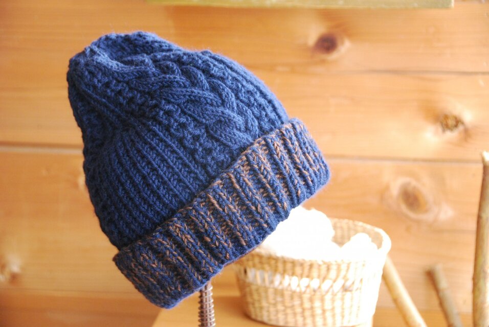 日本製のオーガニックウール糸を使って、アラン模様のニット帽を作りました。