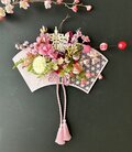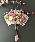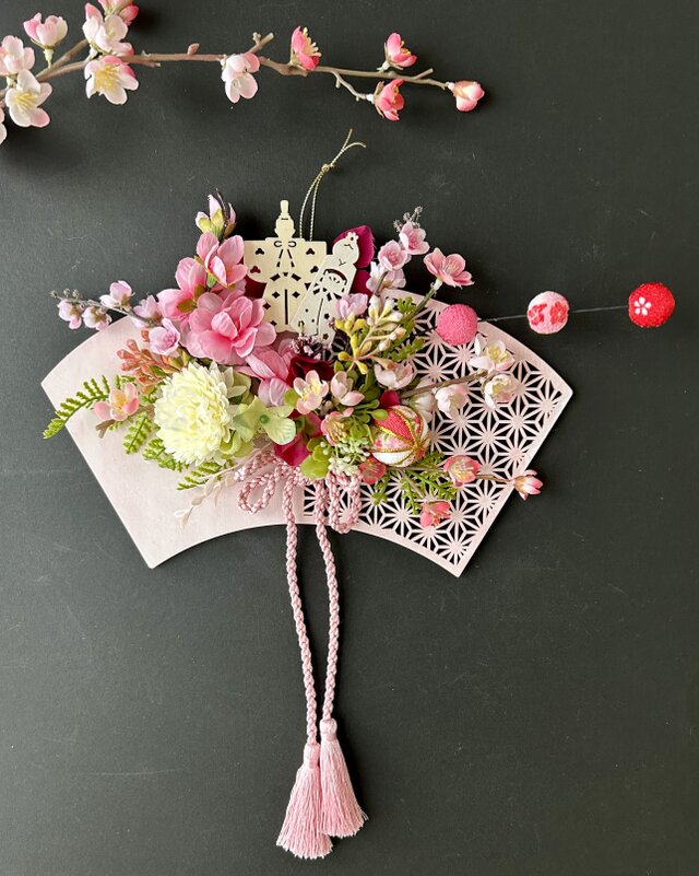 花材:アーティフィシャルフラワー桃な花・マム・ベリー・紫陽花・ダブルタッセル・シダリーフ・チリメン春ピック・プレート・手まり・ミニお雛様など