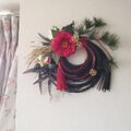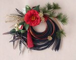 黒い竹のリース台に赤い椿。赤と黒の色の取り合わせは個性的ではありますが、印象的てモダンです。