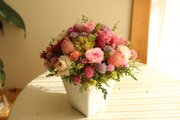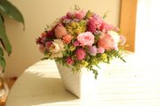 白い四角い陶器にパステル調のお花をアレンジしました。