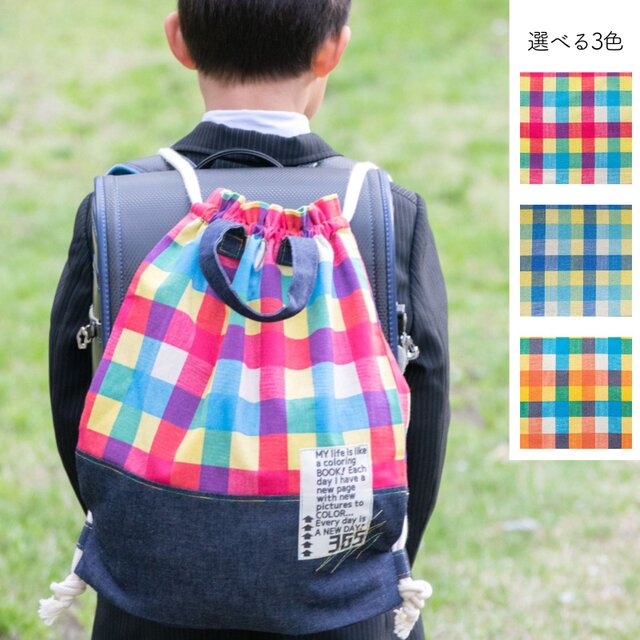 カラフルチェック ナップサック型で背負える体操着袋(着替え袋) |サイズ変更対応