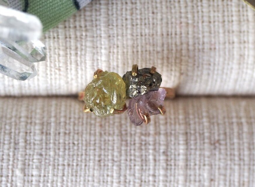 [一点物]原石のグリーンガーネット・スピネル・パイライトのリング w426