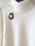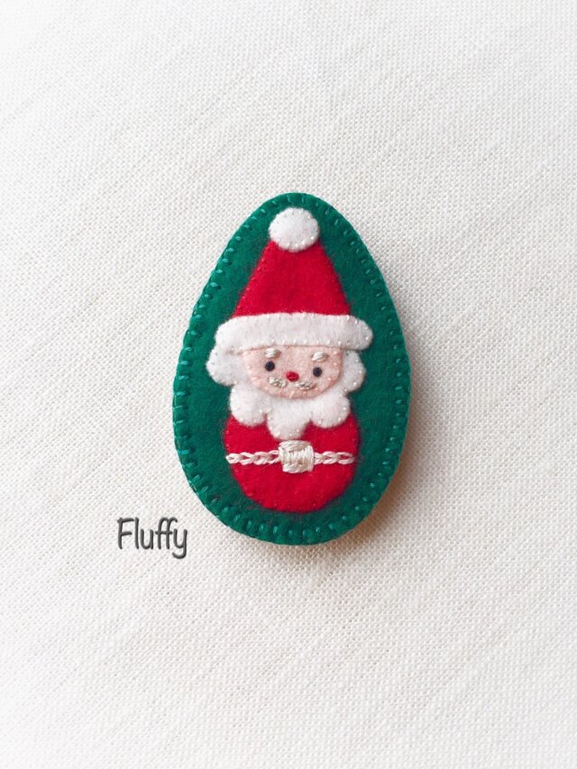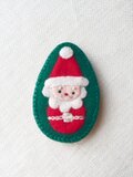 グリーンのフェルトの上に、アップリケと刺繍でサンタを着けたブローチです。