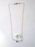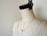 青紫色のタンザナイトのドロップとNY州ハーキマー産のハーキマーダイヤモンドをネックレスに仕立てました。「ハーキマーダイヤモンド」とはNY州ハーキマー地区で採取されるクリスタルです。独特の両端が尖ったカットはダイヤモンドのような煌めきがあります。少し小さめのタンザナイトのブリオレットカットの左右に6石ずつ繋ぎました。ハーキマーダイヤの中央の青いポイントがアクセント。大きすぎず、アンティークな雰囲気が普段使いにぴったり。