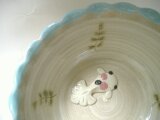 ピンク、オレンジ、ぶちの金魚が泳ぐ、縁取りが水色の金魚レリーフのボウルです。えさ代ゼロ円、金魚のお世話の必要無し。