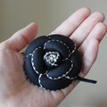 カメリア(つばき)の端正な輪かくを際立たせたコサージュです。ソフトな黒のシルクシャンタンを使用しています。ミニサイズなのでブローチのように気軽に着けられます。中心にはパールをあしらいました。