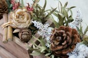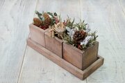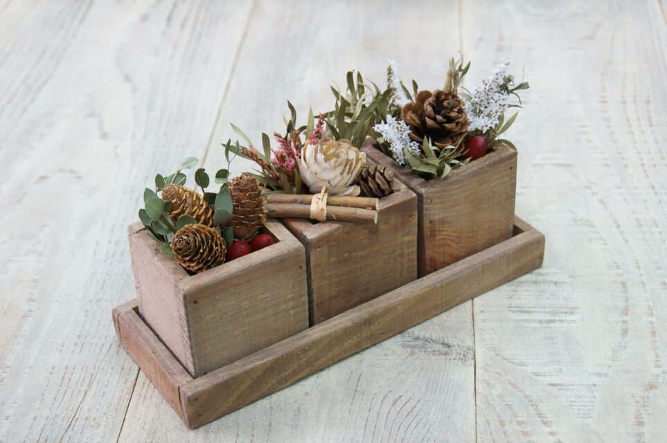 自家製ウッドプランターにドライフラワーと木の実等を詰め込みました。