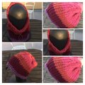 前後にカーブをつけて編んだ筒状になっておりますので、フードのようにかぶって頂いても、また後頭部をくしゅくしゅとさせて、スヌードのようにかぶっていただくこともできます。