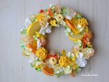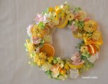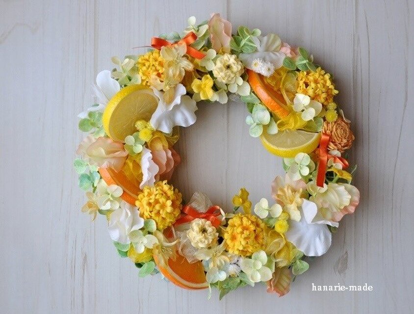 リース土台:ナチュラル素材 直径約20センチ リース素材:アーティフィシャルフラワ-(造花):レモンスライス・オレンジスライス・スイトピー・ミニローズ・イエローボールフラワー・スミレ・デルフィニウム・ユーカリ、など。自然素材:ソフトイモーテル、ソーラーローズ、など。その他:リボン飾り、オーガンジーリボンのモチーフ(取り外しできません)、など。