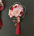 花材:アーティフィシャルフラワー桜・ファレノ・ピオニー・ベリー・つばき・松・リーフ・サテンピック・ウッドプレート・タッセル