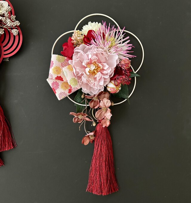 花材:アーティフィシャルフラワーピオニー・マム・はなみずき・ベリー・手毬・タッセル・リボン