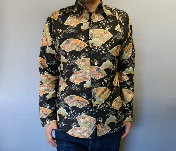 新作手作り長袖和柄シャツ(扇)