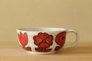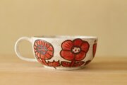信楽の赤土に白化粧を施しぐるりと赤いお花を並べて描きました。