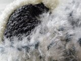 毛足の長いファーヤーン、柔らかいウールの糸、ユキヒョウのようなアニマル柄のファーが全体を引き締めます。