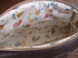 とても生地の柄がかわいいです☆中の生地もスエードで厚みもあり安心感があるしっかりしたお品だと思います。 長財布や小さめの折りたたみ傘など見た目よりもたくさん物が入ります。すごいですね! お気に入りのポーチ鞄となりました。 購入良かったです。