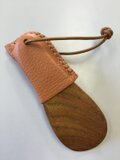 北海道の木工職人さんに特注で本体をお願いし、てしごと★足靴工房が革をハンドステッチしました。