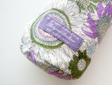 元気なひまわり柄のスモールスザンナ。沢山のひまわりが丁寧に描かれています。 生地の地の色がオフホワイト、お花には、パープル、ライトパープル、グリーン、モスグリーン、スカイブルーなどが配色されています。
