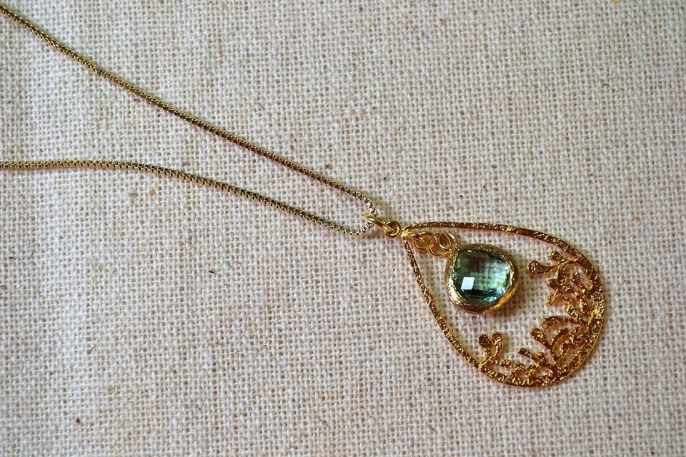 しずく型のモチーフにゴールドのトリミングされた天然石ペリドットが