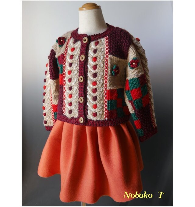 英国タータンチェックの色合いを思わせる手編みカーディガンです。