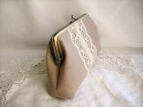 サンドベージュリネンにアンティークハンドメイドボビンレースをのせたがま口ポーチ