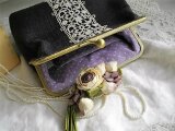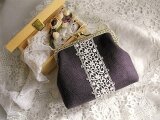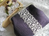 ダークブラウンに近いシックな色合いのパープルリネンにアンティークレースをのせたがま口ポーチ