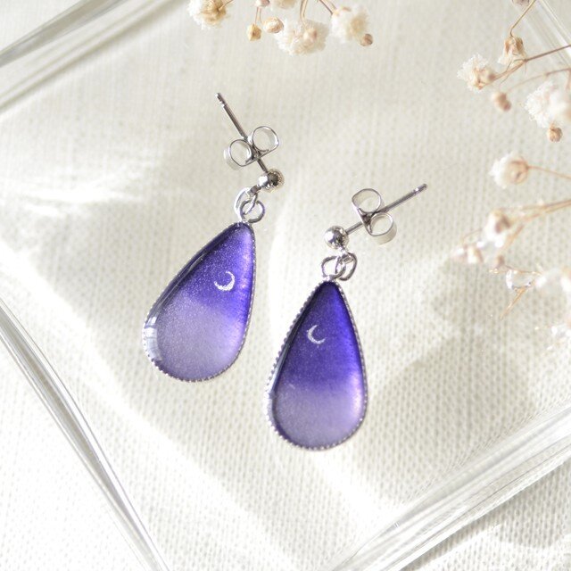 銀色の三日月を描いた絵を、樹脂で閉じ込めたピアスです。