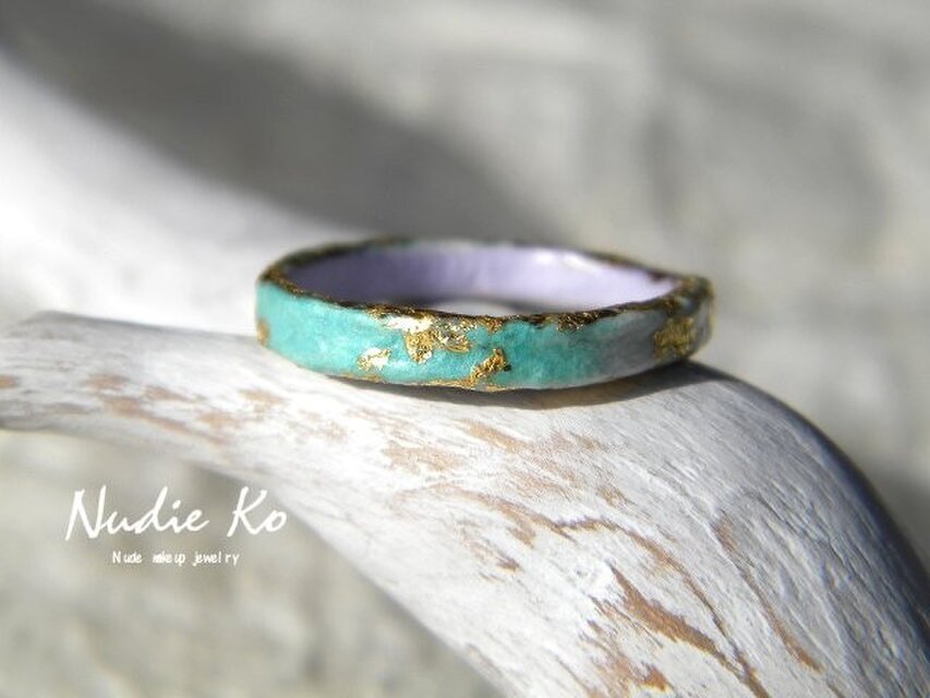 和紙を幾重にも貼り重ねたリングです。若草色のグラデーションと金箔の組み合わせで、