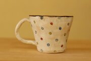信楽の白土に白化粧を施し手びねりで仕上げた生地にカラフルにドットとりすと裏面にきのこを絵付けしました。
