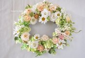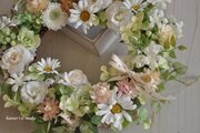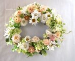 真っ白、ライトグリーン、そしてヴァニラ色の小さなバラと、マーガレットをえらびました。あいだに、ナチュラルカラーやピンク色のムギワラギクを点々とそえました。白い小花も風に揺れるようにそえて、色味を抑えた、ナチュラルな雰囲気のリースにしました。