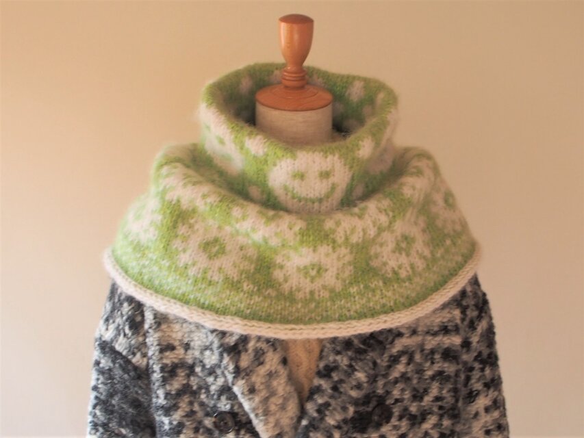 ニコニコマークの図案を作って編み込んだネックウオーマーです。(図案はニコニコHAPPY帽子の方に掲載しています。)