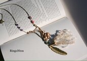 ふわふわAVRILヤーンをタッセル状にして、羽根モチーフと組み合わせた、ペンダントタイプのクラシカルなロングネックレス。