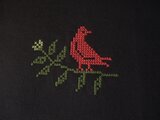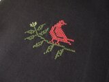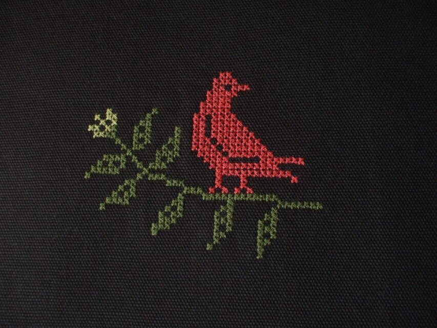 茶色の綿生地にクロスステッチで鳥と葉を刺繍しました。