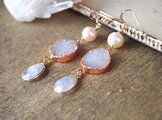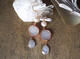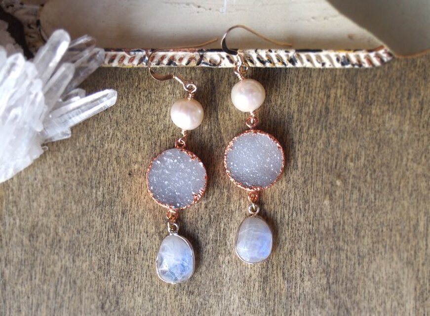 素材:パール・ドゥルージークォーツ・ロイヤルブルームーンストーン・シルバー(石枠)・K14ゴールドフィルド(ピアス金具)