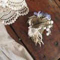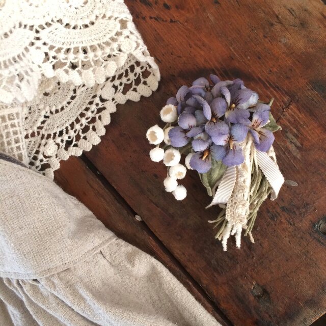 すずらんとすみれにレースなどを合わせてクリップ付きのコサージュに仕立てました。