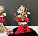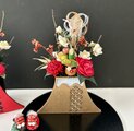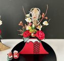 花材:アーティフィシャルフラワー椿・梅・マム・松・ベリー・笹・ちりめん門松・水引・鶴・器(ウッド)