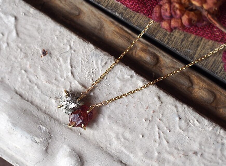 深紅が美しいガーネットと独特の金属光沢が個性的なパイライト。