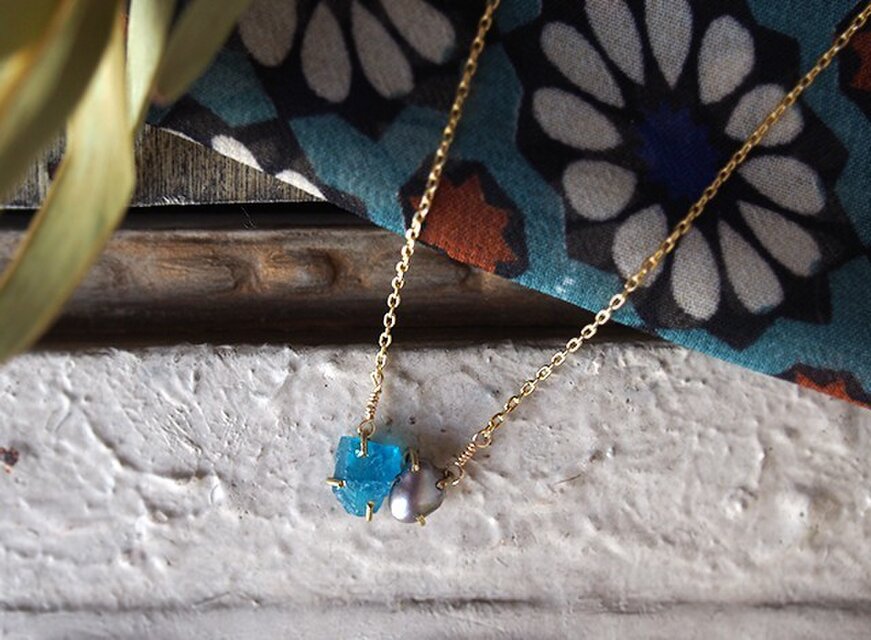 鮮やかなブルーと原石の質感が美しいアパタイトと、上品な輝きのグレーパール。