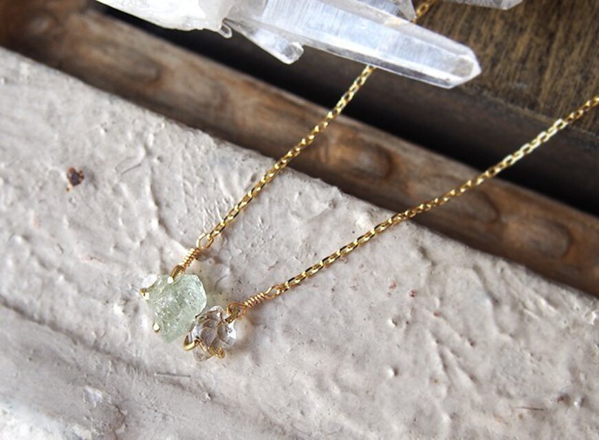 原石のエメラルドとダイアヤモンドクォーツのネックレス