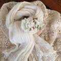 オフホワイトに染色したオーガンジーのポピーやデージー、すみれなどをレースと麻布の土台にコラージュしました。