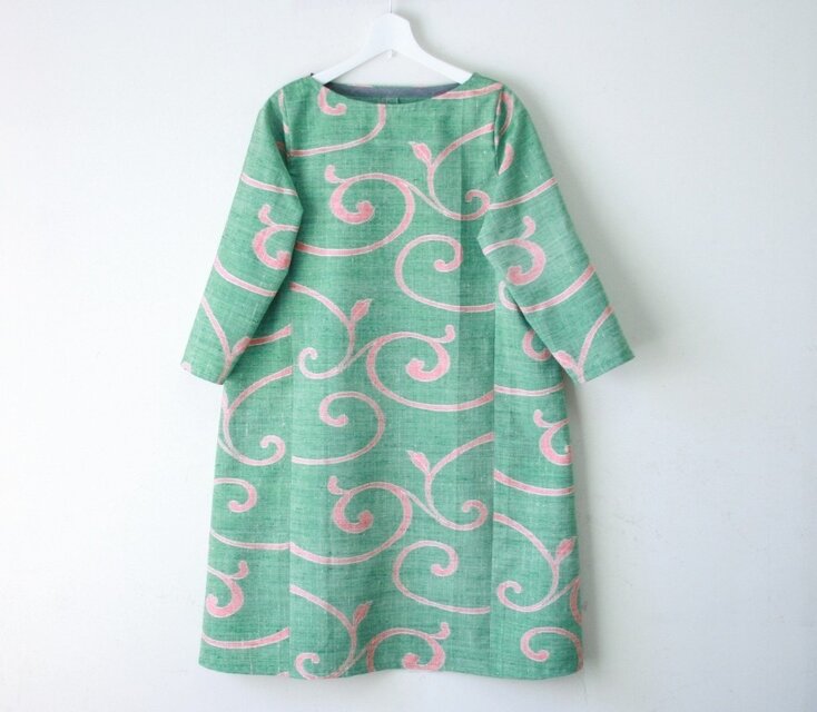 昭和にかけて作られたと思われる紬のの着物を丁寧にほどき、シンプルなワンピースを作りました。三角形のように見えるゆったりとしたシルエット。
