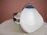 白の部分は釉薬の天然成分で茶色の斑点があります.底は3本足で,端のほうを押さえるとひっくり返ります.あまり一般家庭でこういう器はなさそうなので,使ってみるとオシャレじゃないかなと思っています.