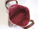 焦げ茶色の皮の持ち手を付け、口はマグホックでとめるようになっています。内側には、イチゴミルクのような色のコットンを使い、縦18.5㎝×横22㎝、縦18.5㎝×横16㎝の2室に分かれた内ポケットをつけました。