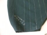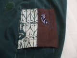 グリーン2種の風呂敷からのリメイクです。1枚はアンティークで使われていたもの。痛みがありパッチしました。もう一枚は新品です。千鳥と篭目の刺し子をしてみました。ポケットの模様は茄子です。前後はありません。2通り楽しんでいただきたいと思います。